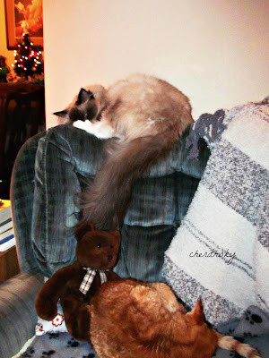 Hi now from Miss Emily! I've been trying to keep out of trouble! I have a question for you...perhaps you have some suggestions? My Mom's mom has a cat, Pearl, I believe we have introduced her to you before. This is Pearl being all cuddly at Christmas.